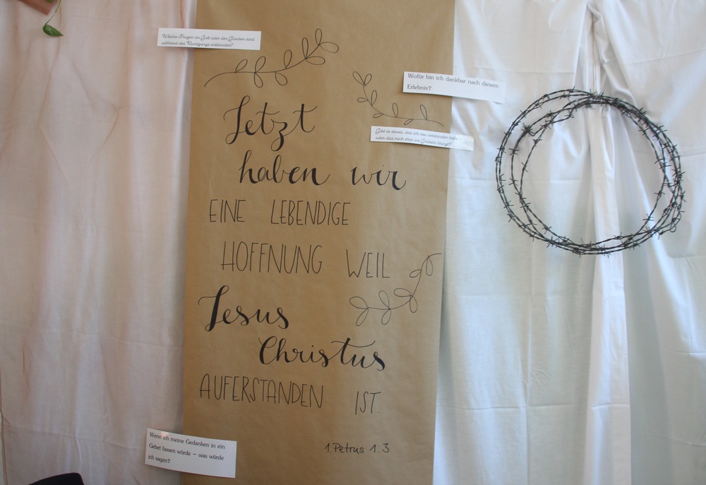 In der Zeit vom 24. März bis zum 03. April 2026 hat in unserem Gemeinschaftshaus eine Ausstellung rund um die biblische Ostergeschichte stattgefunden. Mehr als 900 Personen von Klein bis Groß sind mit uns auf den Spuren von Jesus gewesen und haben sich eindrücklich in die Passionsgeschichte von Jesus vertiefen können. Der Weg führte uns vom Grab und der Frage, ob mit dem Tod alles aus sein wird zum Tempel nach Jerusalem. Wir haben uns die Frage gestellt, wie wir Jesus empfangen und was wir von ihm erwarten.